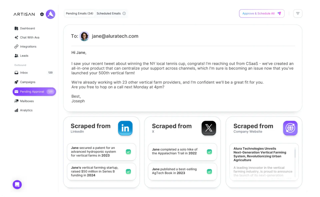 Ava can build targeted prospect lists, enrich lead data, improve email deliverability, run background A/B tests, and send multi-channel outreach messages across email and LinkedIn. You can also choose between full automation or human review mode to maintain control over messaging and targeting.